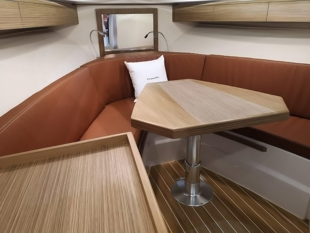 Unter Deck befindet sich eine V-Kabine mit einem Lichthof, der in das Wagendach integriert ist. Das Boot beherbergt eine Toilette mit Dusche, Kühlschrank, Spüle/Getränkebereich, einen aufklappbaren Kabinentisch und die Möglichkeit einer zentralen Doppelkoje unter der Cockpitsohle. Gibt es einen eleganteren und leistungsfähigeren Daycruiser?